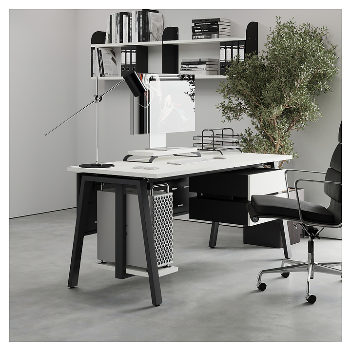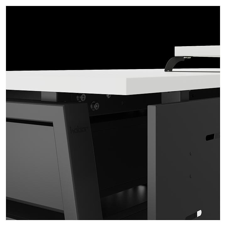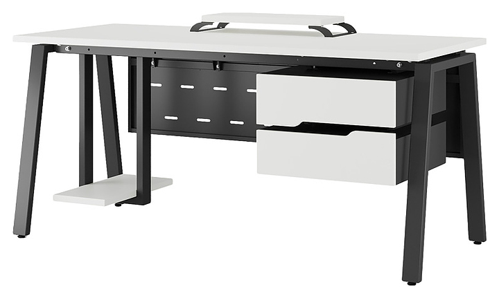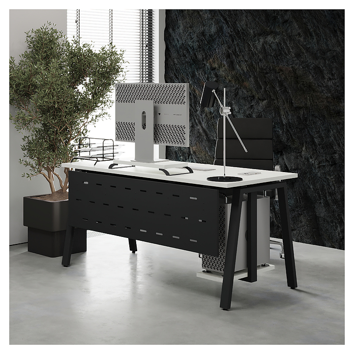 Компьютерный стол Кобор KA-180/70 black/premium используется в офисных помещениях и кабинетах руководителей. Модель оснащена A-образными опорами. Каркас выполнен из металла, выкрашенного в цвет черный муар (RAL9005), столешница – из ламинированной древесно-стружечной плиты (ЛДСП) цвета белый премиум (W1000 S9). Опции (заказываются отдельно):