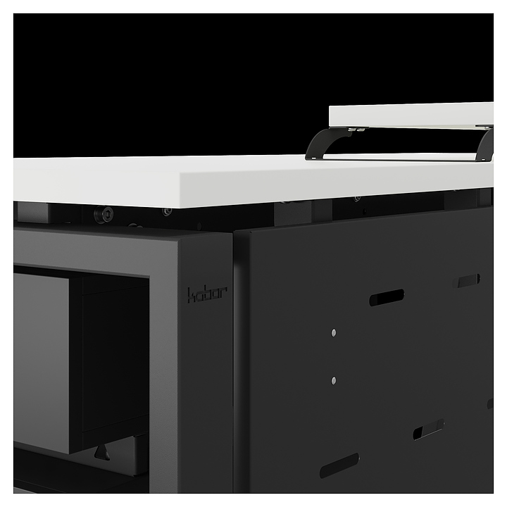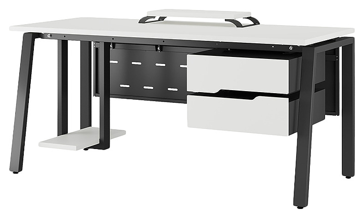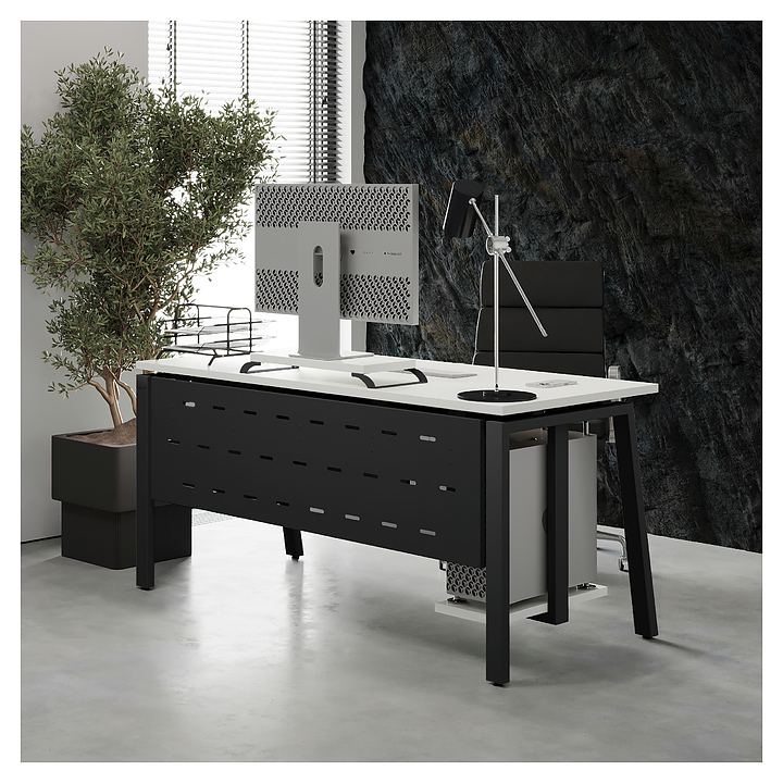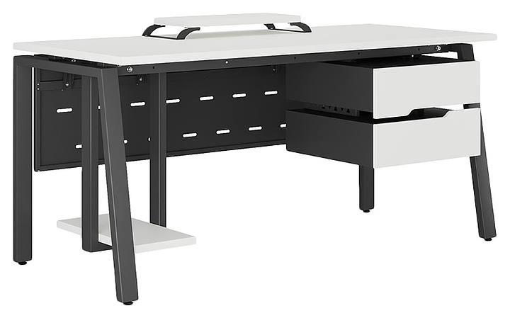Компьютерный стол Кобор KAB-120/70 black/premium используется в офисных помещениях и кабинетах руководителей. Модель оснащена A-образными опорами со скошенными фронтальными сегментами. Каркас выполнен из металла, выкрашенного в цвет черный муар (RAL9005), столешница – из ламинированной древесно-стружечной плиты (ЛДСП) цвета белый премиум (W1000 S9). Опции (заказываются отдельно):