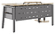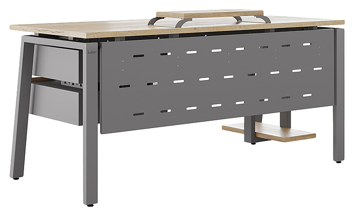 Компьютерный стол Кобор KAB-160/70 aluminum/natural используется в офисных помещениях и кабинетах руководителей. Модель оснащена A-образными опорами со скошенными фронтальными сегментами. Каркас выполнен из металла, выкрашенного в цвет алюминиевый металлик (RAL9006), столешница – из ламинированной древесно-стружечной плиты (ЛДСП) цвета натуральный дуб (H1180 ST37). Опции (заказываются отдельно):