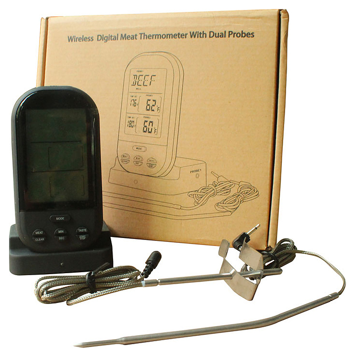 Беспроводной дистанционный цифровой термометр используется совместно с керамическими грилями Green Kamado для точного измеряния одновременно температуры блюда и температуры под куполом. Поместите щуп с передатчиком в приготавливаемое блюдо и считывайте показания температуры с приемника на расстоянии до 100 м от него. Как только будет достигнута нужная температура внутри блюда, термометр автоматически подаст сигнал. Термометр имеет программу для приготовления: говядины, барнины, телятины, гамбургера, свинины, индейки, курицы и рыбы. Характеристики: